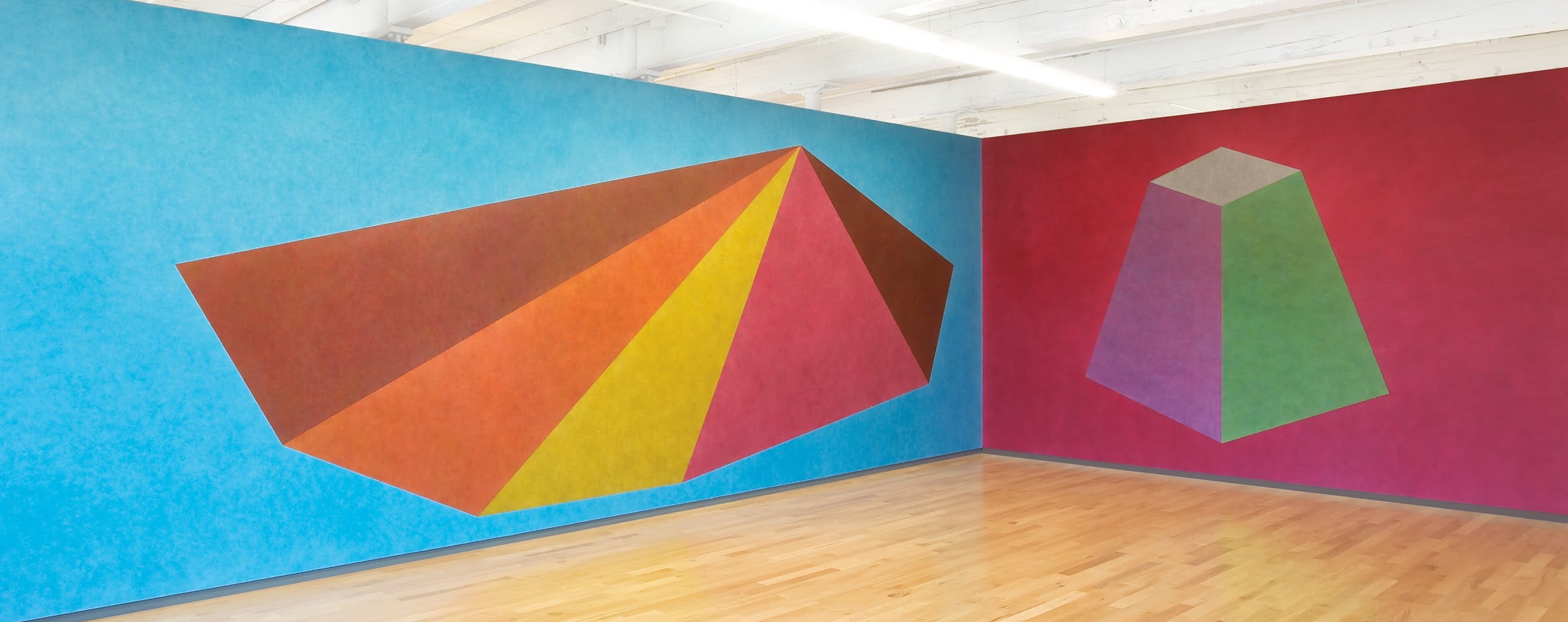 Wall Drawing #439 (1985) — Made in Italy. Colour ink washes in cascading triangles. The conceptualist discovers what Giotto knew: you can create depth on a flat plane with nothing but colour and conviction.