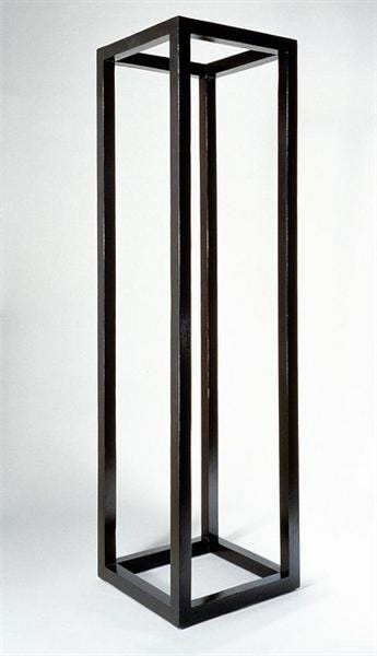 Standing Open Structure, Black (1964) — A painted black wooden rectangle, 96 inches tall. Human-sized. Skeletal. The prototype for everything. When a museum later asked if they could just rebuild it elsewhere (since he was a conceptualist…), he says no: “Would you repaint a Mondrian?”