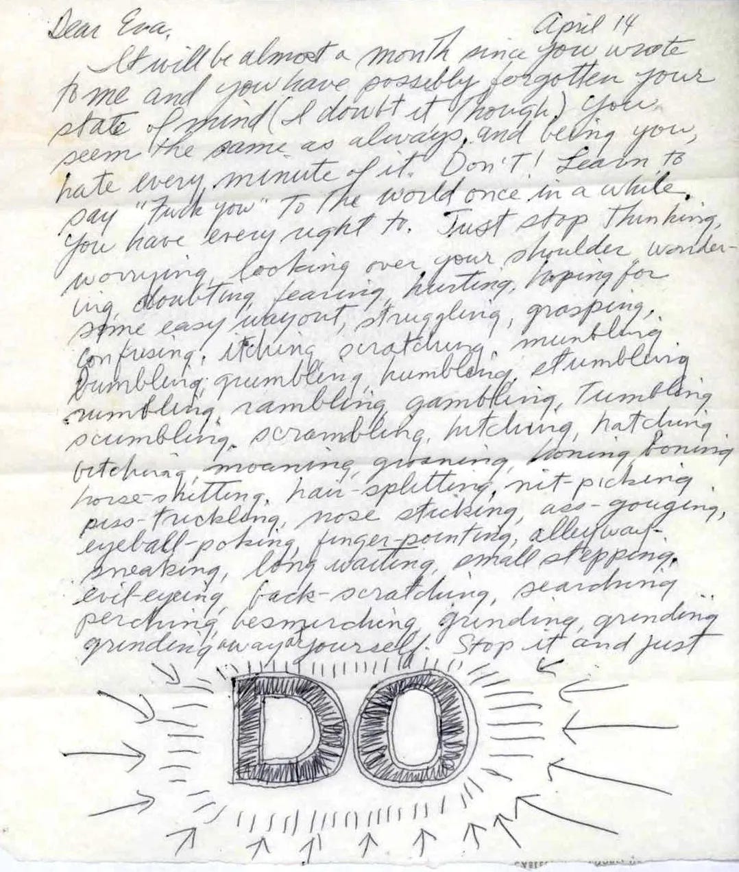The Letter to Eva Hesse (1965) — Not technically an artwork. But 100% Art lore. A letter to a friend who was paralysed by self-doubt. “Do more. More nonsensical, more crazy, more machines, more breasts, penises, cunts, whatever — make them abound with nonsense.” “You belong in the most secret part of you. Don’t worry about cool, make your own uncool. Make your own, your own world.” This letter circulates today like a prayer for blocked artists. It reveals the thing the conceptual framework sometimes hid: LeWitt believed in feeling first, systems second.
