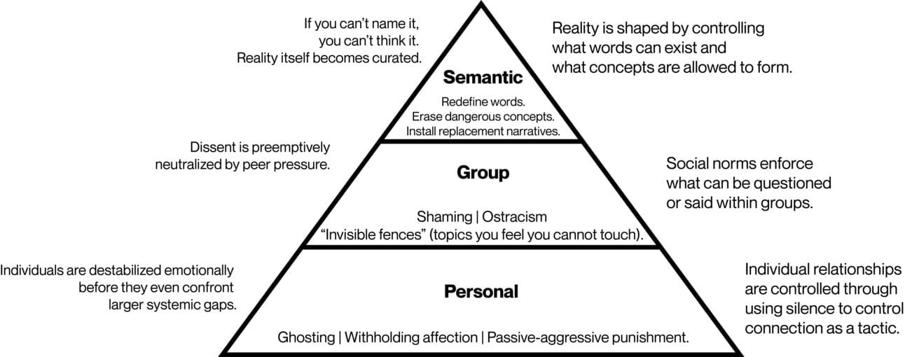 Silence became a weapon scaled for institutions, for systems, for the very architecture of public life.